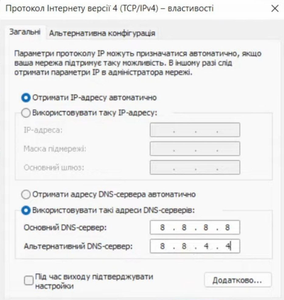 4. Попробуйте в настройках сети Windows указать DNS сервера гугла: Основной - 8.8.8.8. и запасной 8.8.4.4